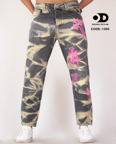 شلوار جین مام فیت فول کاستوم شده خفن طرح تای دای گرافیتی مردانه - کد 1390