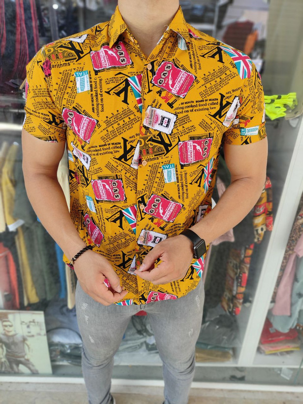 پیراهن هاوایی خردلی طرح لوییز ویتون