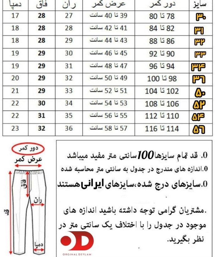 | سایز | دور کمر (سانتیمتر) | قد شلوار (سانتیمتر) |
