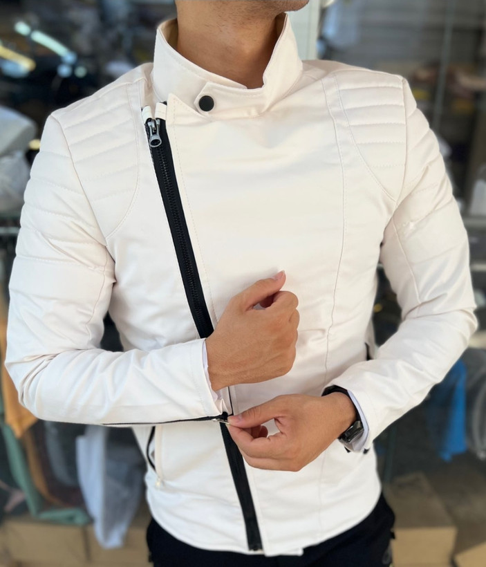 کاپشن چرم سفید زیپ کج مردانه مدل gfj655