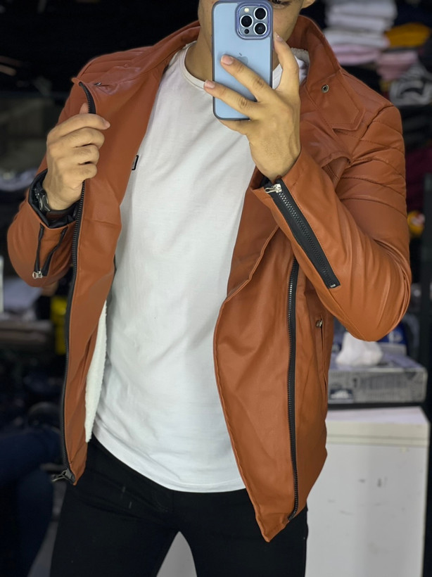 کاپشن چرم عسلی زیپ کج اسپرت بسیار جذاب و جدید 2024