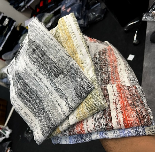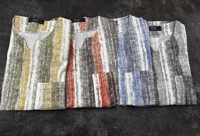 تیشرت راه راه مردانه یقه کوبایی با پارچه کنفی و برش آزاد( Over size) بسیار شیک و خنک