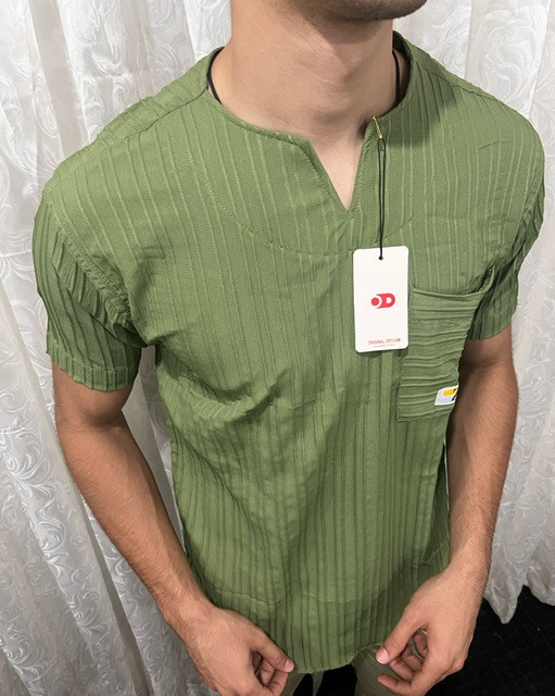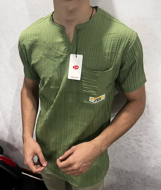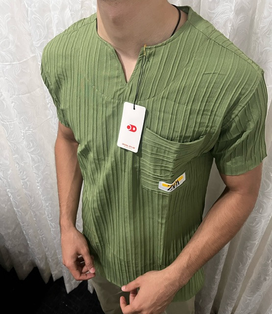 تیشرت یقه کوبایی پارچه کراش بسیار خنک و شیک رنگ سبز ماشی