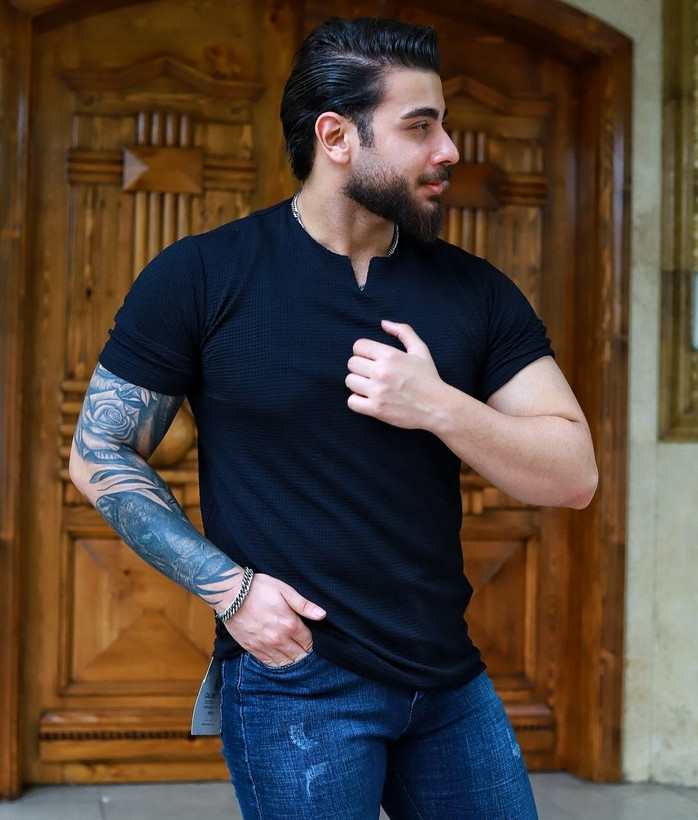 تیشرت یقه کوبایی مشکی پارچه ببسکوییتی