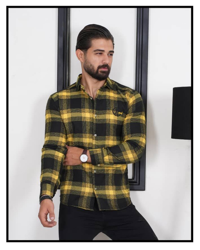 پیراهن چهارخانه پارچه پشمی طرح جذاب مشکی خردلی