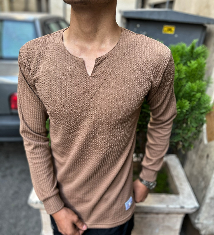 تیشرت آستین بلند یقه کوبایی درجه یک رنگ شتری