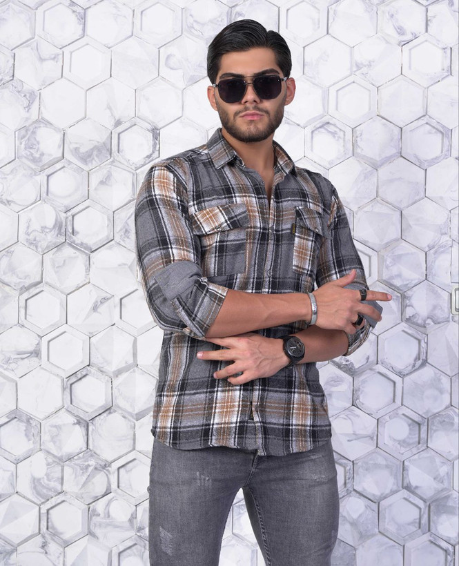 پیراهن پشمی ضخیم طرح چهارخونه رنگ طوسی
