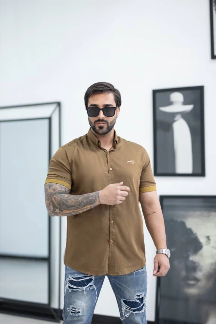 پیراهن آستین کوتاه قهوه ای مردانه پارچه نخ پنبه | استایل تابستانی