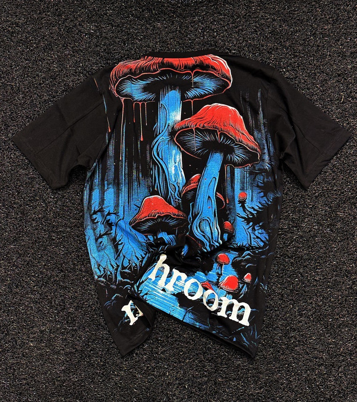 نقش استفاده شده در پشت تیشرت، تصویری هنری و خیرهکننده از قارچهای سایکدلیک با کلاهکهای قرمز درخشان و ساقههای آبی فسفری است. این طرح با الهام از هنر سایکدلیک و فانتزی طراحی شده و فضایی رؤیایی و شبانه را تداعی میکند. جزئیات ظریف در طراحی قارچها، برگهای اطراف و قطرات آب با تکنیک سایهروشن هنرمندانه، عمق بصری خاصی به این طرح بخشیده است.