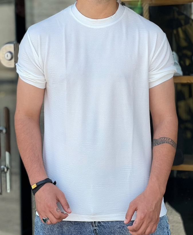 تیشرت یقه گرد بافت حصیری پارچه درجه یک نیم لش| سفید