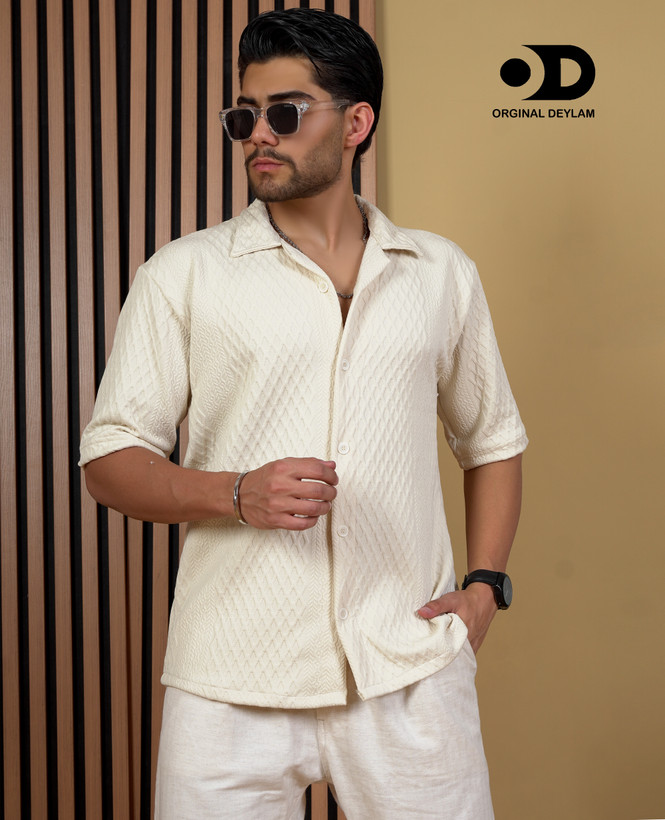پیراهن لش یقه انگلیسی کرم استخونی مردانه | استایل اولد مانی تابستانی