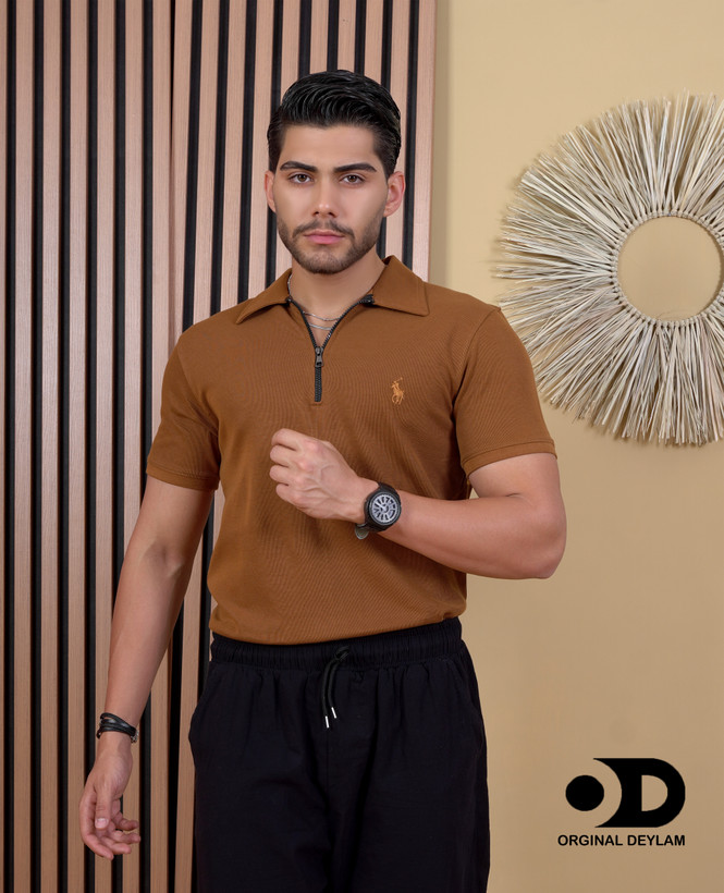 تیشرت نیم زیپ مردانه شکلاتی | پارچه پنبه کبریتی خنک اعلا قواره اسلیم فیت