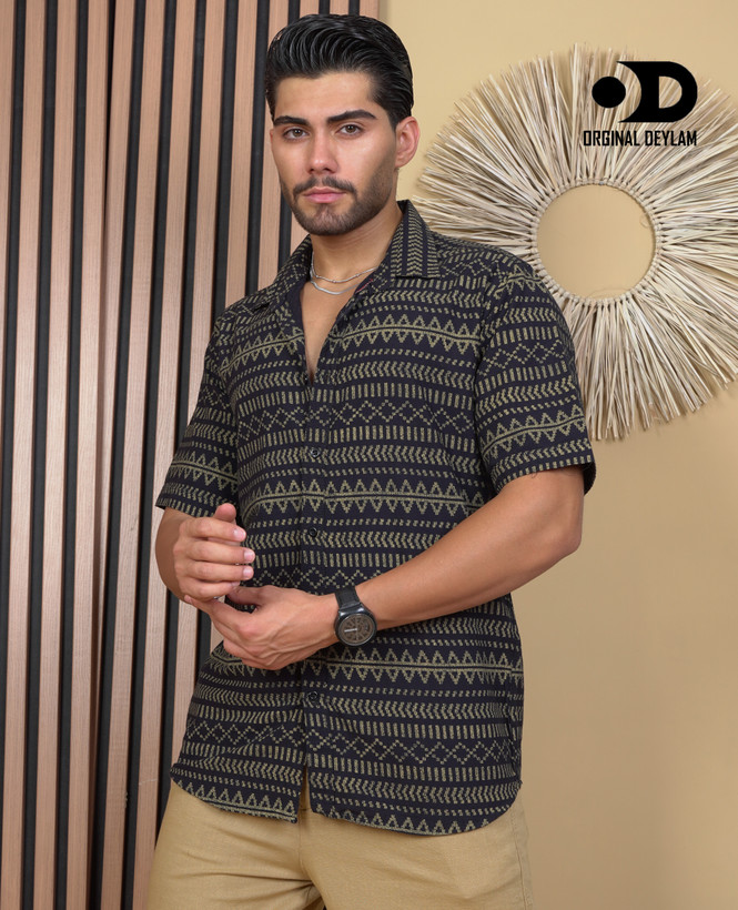 پیراهن کنفی پارچه کنف طبیعی 🎨 طرح هندسی اصیل - اتنیک مردانه