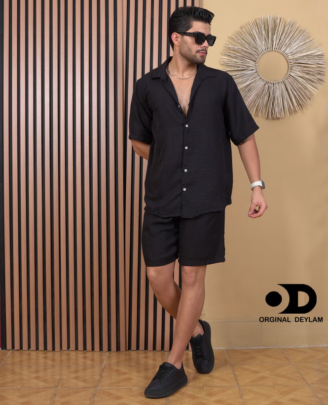 ست روهمی پیراهن شلوارک مشکی مردانه پارچه کراش | استایل لش اولد مانی