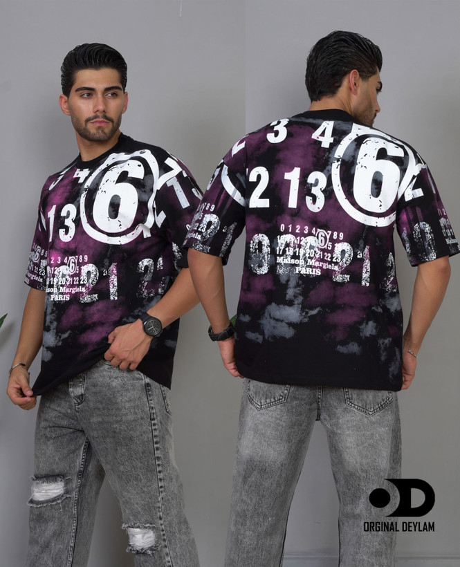 تیشرت اوورسایز MM6 Maison Margiela با طراحی منحصربفرد اعداد و بافت تایدای بنفش-مشکی، نمادی از هنر مفهومی در دنیای مد است. این قطعه با پارچه ماکان قواره لش، ترکیبی از فلسفه طراحی ژاپنی و شیک پاریسی را به نمایش میگذارد. چاپهای عددی پراکنده و لوگوی برند، داستانی از دیکانستراکشن و بازآفرینی را روایت میکنند.