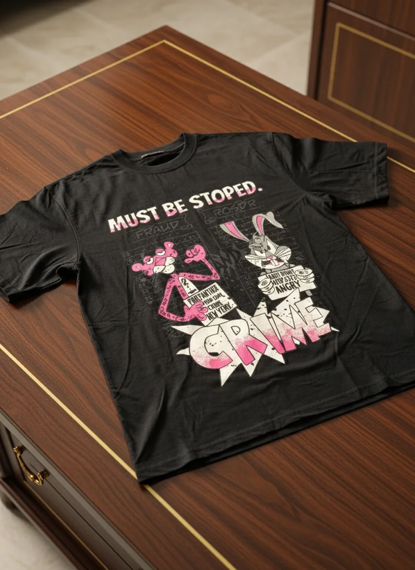 کاراکترهای پلنگ صورتی و خرگوش با سبک کارتونی دهه 90، رنگهای صورتی نئونی و شعار "Must Be Stoped Crime" که یک پیام اجتماعی طنزآمیز ارائه میدهد.