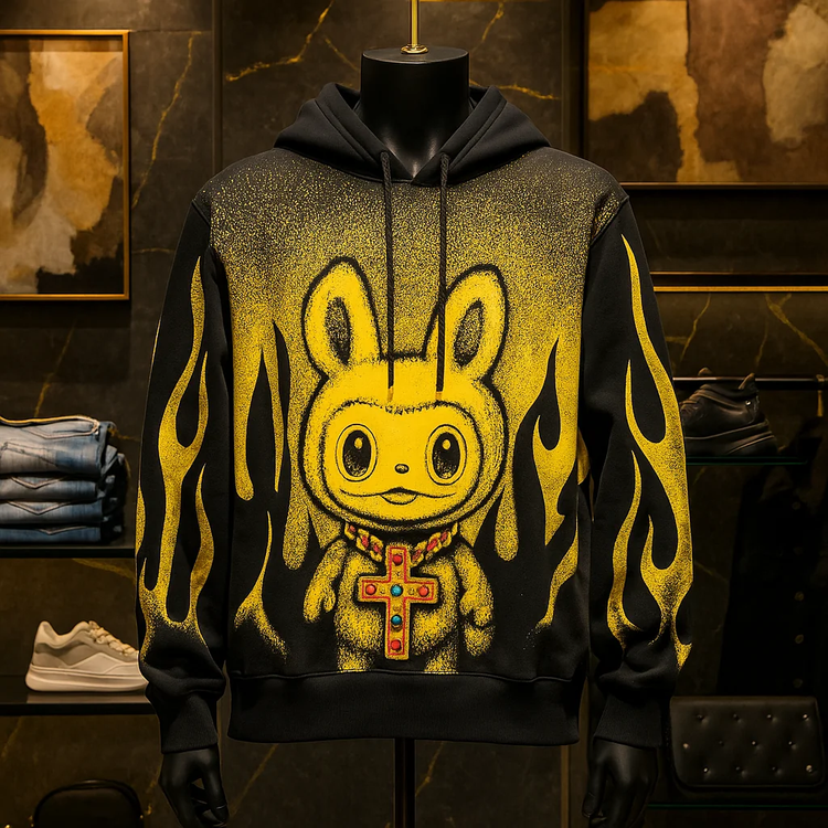هودی لبوبو مشکی نگین‌کاری پشت چاپ رنگی لش استایل | فوق‌العاده با کیفیت و خفن