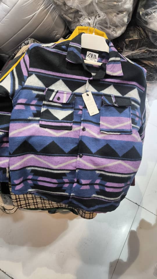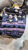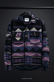 کت فوتر پشمی با طرح هندسی مدرن داری (ترکیب رنگ مشکی، بنفش و آبی با پترن‌های زاویه‌دار) | سنگین‌وزن