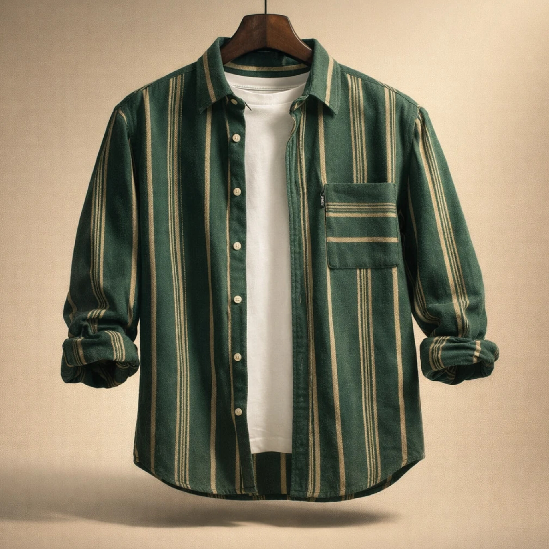 این پیراهن آستین بلند با پارچه پشمی پرمیوم 60% پشم طبیعی و 40% پنبه مصری بافته شده است. رنگ اصلی سبز یشمی (#2e7d5f) با راهراههای عمودی بژ کرمی (#d4c5a0) ایجاد کنتراستی ملایم اما چشمنواز کرده که به پیراهن عمق و جذابیت بصری میبخشد. یقه کلاسیک button-down، دکمههای سفید صدفی، جیب سینه با همان الگوی راهراه که عمودی تراز شده، آستین بلند با دکمه تنظیم، و دامن منحنی از ویژگیهای طراحی هستند. پارچه پشمی این محصول در شرایط سرد گرمای عالی ارائه میدهد، در عین حال تنفسپذیر است و پوست را خفه نمیکند.