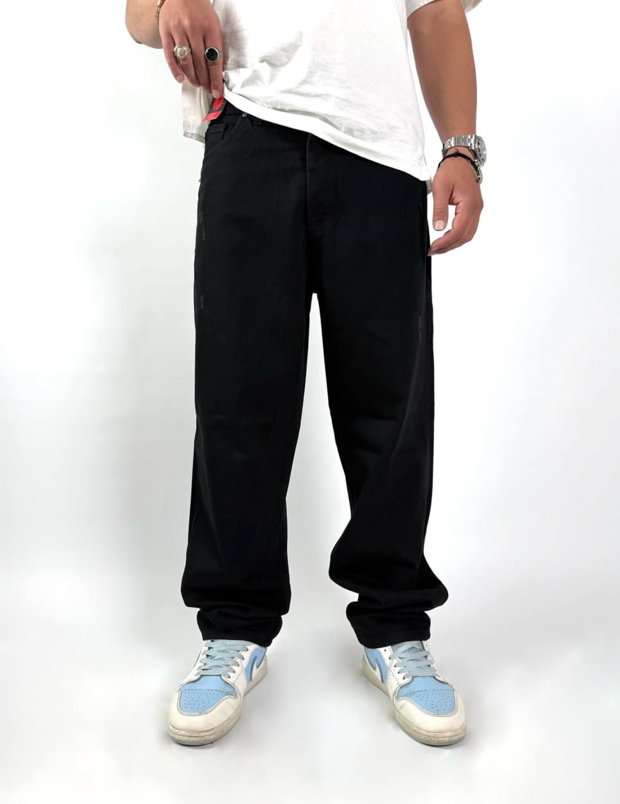 شلوار نیم بگ مشکی پرکلاغی مردانه پارچه جین پنبه کجراه سنگشور گرماژ بالا با قد ۱۱۰ سانت کد b۱۸۱