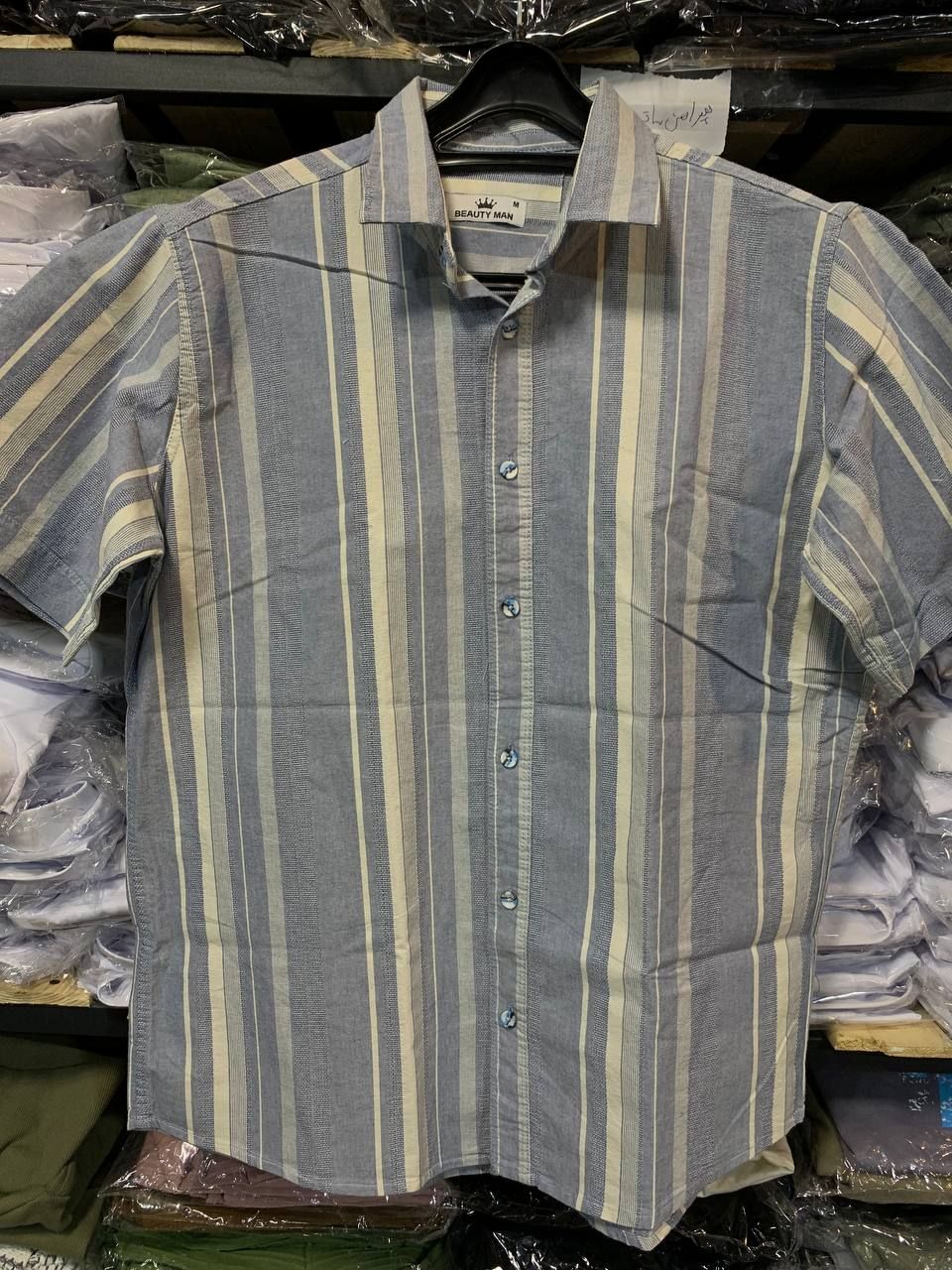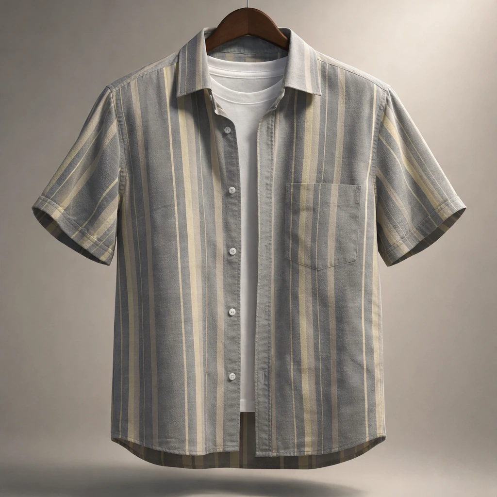 «پیراهن آستین کوتاه راه‌راه طوسی–کرم مه نقره‌ای»