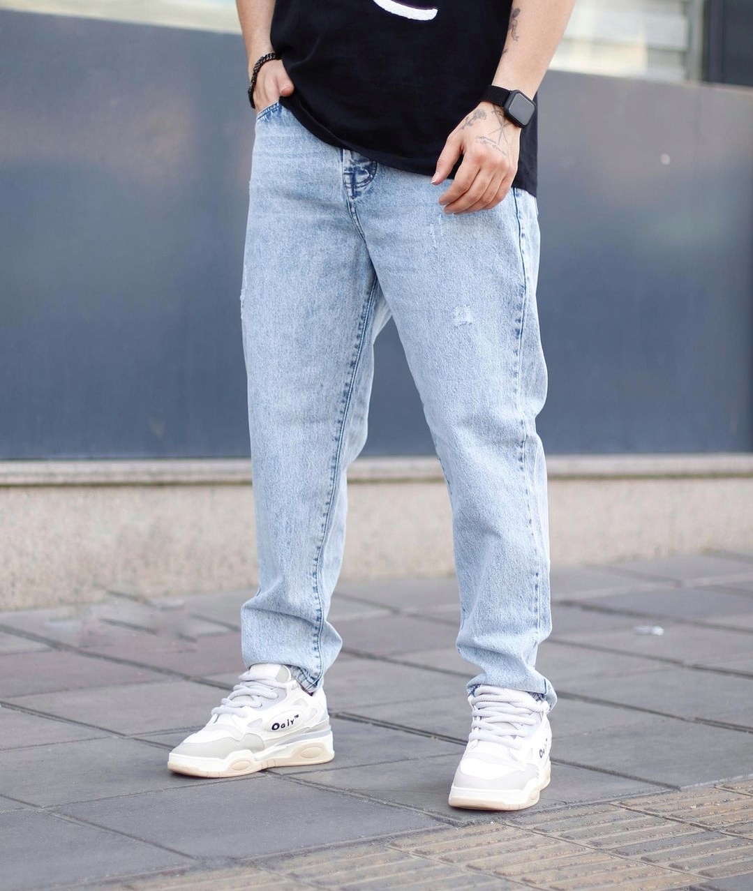 شلوار جین مام فیت آبی یخی زاپ مینیمال سطحی کیفیت عالی