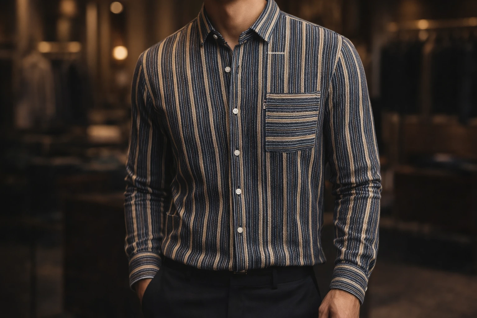 ترکیب هوشمندانه راه راههای عمودی و افقی در جیب سینه، خطوط تمیز و رنگآمیزی متعادل ذغالی و کرم که همزمان کلاسیک و معاصر است.