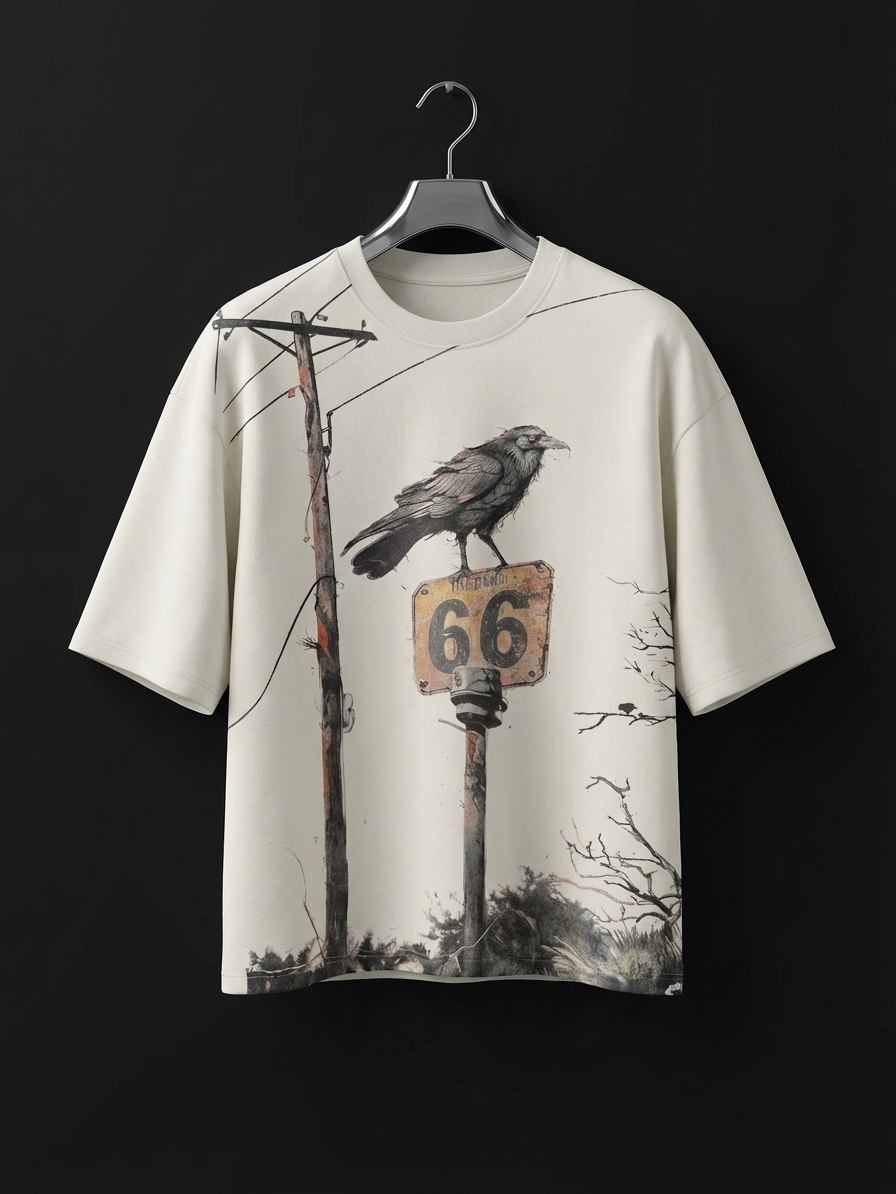 طراحی گرافیکی این تیشرت با الهام از سبکهای هنری مدرن و استریتویر انجام شده است. وجود تصویر کلاغ در کنار المانهای گرافیکی و فضای هنری، حس متفاوتی به لباس میدهد و آن را از یک تیشرت ساده به یک آیتم استایلی خاص تبدیل میکند.