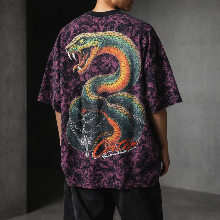 🔥تیشرت فانتزی طرح افعی تمام چاپ(دیزاین سنگین) فانتزی وایب استریت * پشت و رو چاپ باکسی لش® پارچه دورس دونخ پنبه