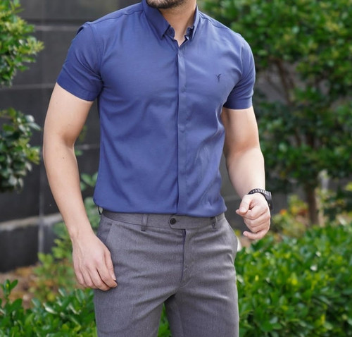 پیراهن ساتن کش درجه یک [آستین کوتاه] آبی کلاسیک
