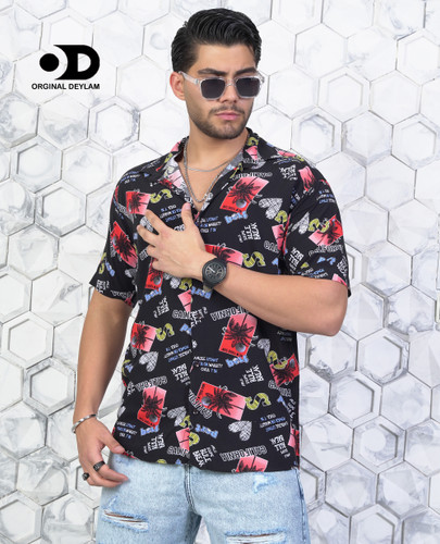 پیراهن هاوایی مشکی قرمز مردانه طرح اسپرت کالیفرنیا